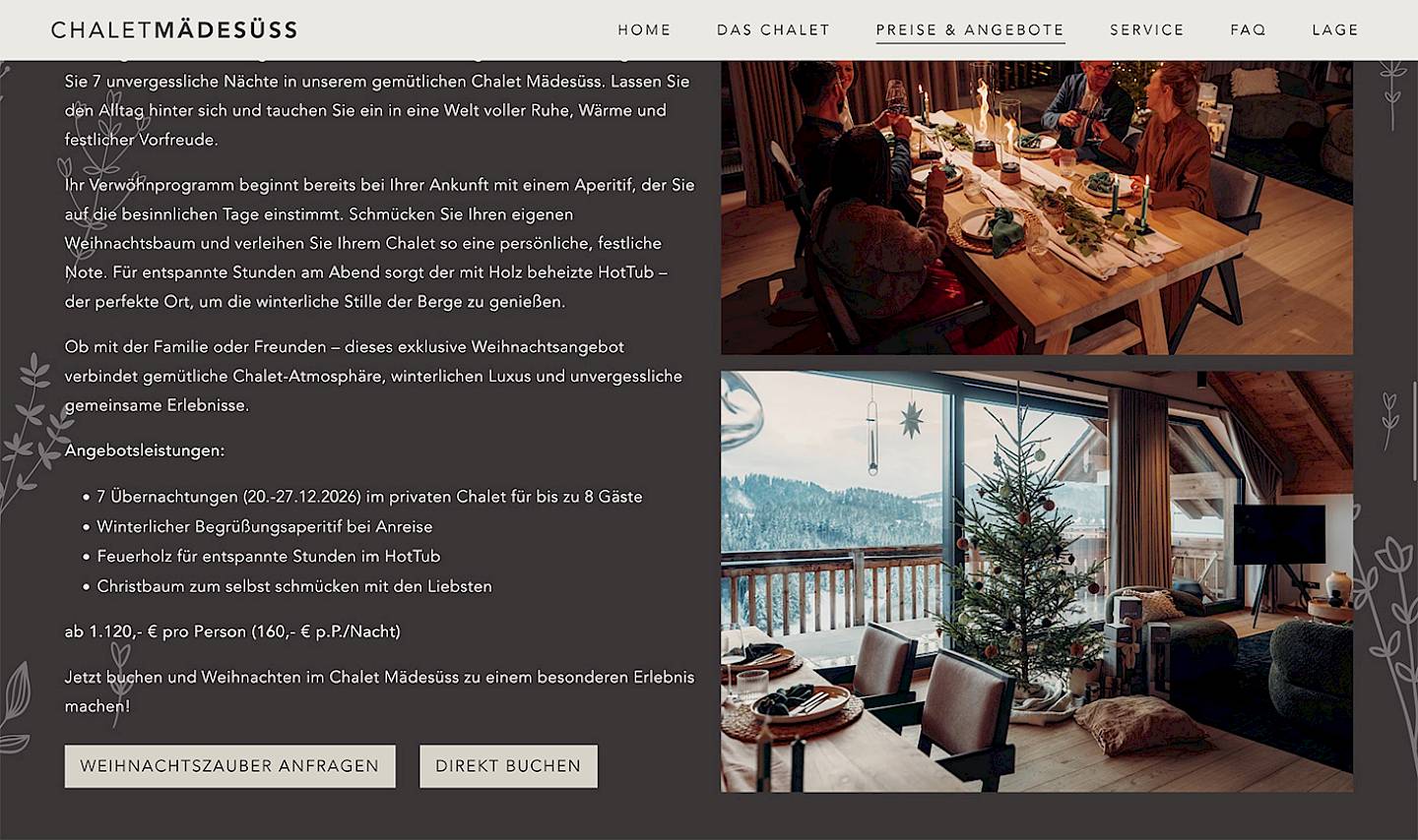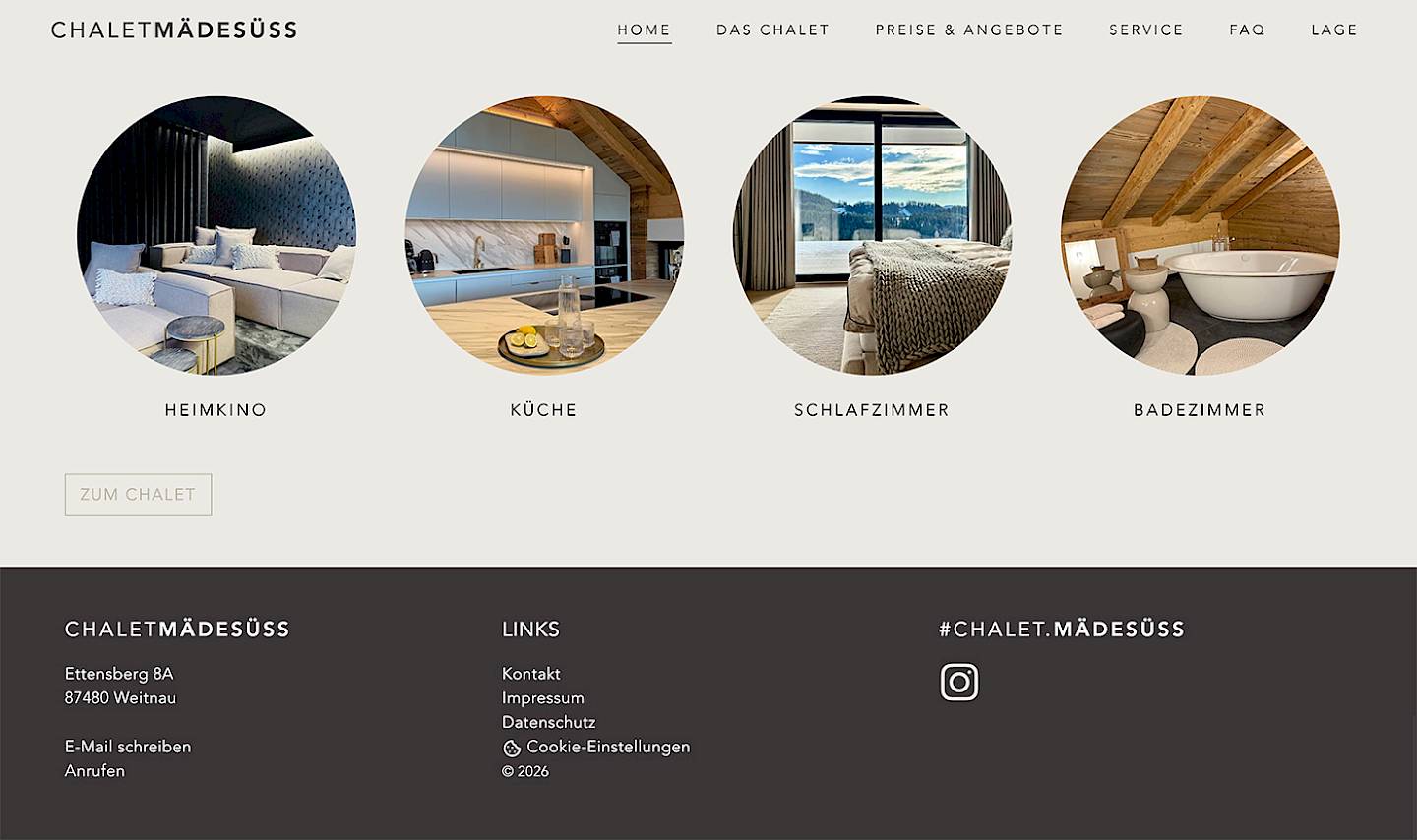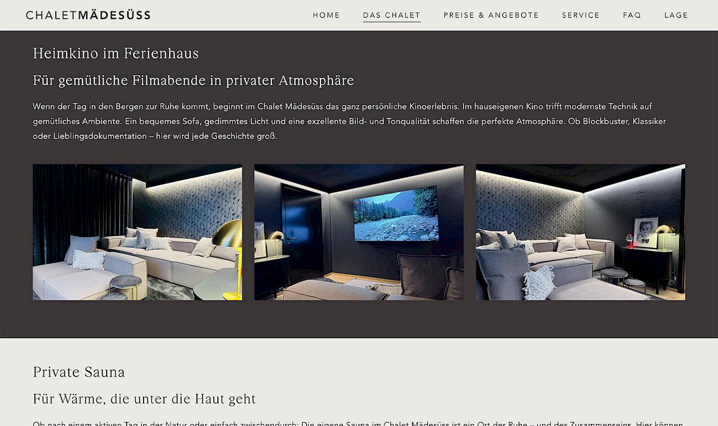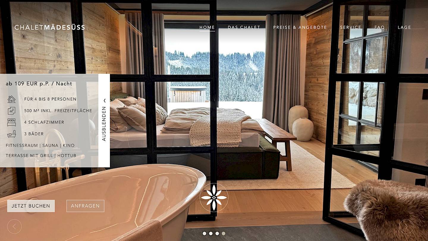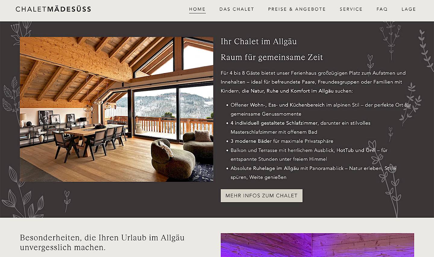 Exklusives Ferienhaus im Allgäu. In Zusammenarbeit mit der Project N8 Wohnen GmbH wurde das schlichte und ansprechende Layout entwickelt und in flexible Gestaltungsvorlagen übertragen. Die Seite des chalet mädesüss ist sehr variabel und lässt sich durch Redakteure frei gestalten. Das Konzept wurde für das klopferhaus oberstdorf (ebenfalls Project N8 Wohnen GmbH) übernommen und um weitere Farb- und Darstellungsvarianten erweitert.